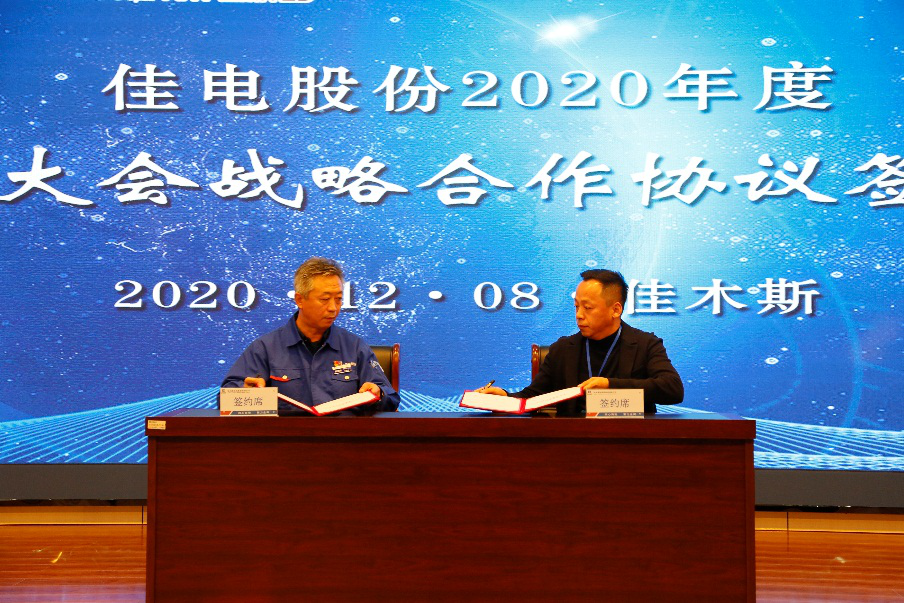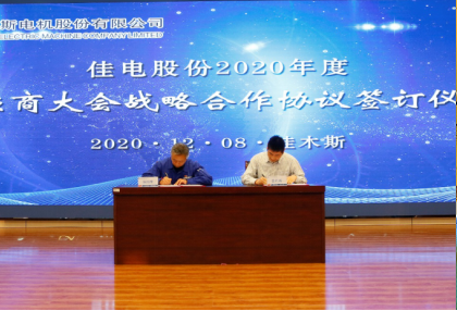 姜清海代表佳電股份與杭州華光、遼寧東港、申科股份三家戰(zhàn)略供應(yīng)商代表簽訂戰(zhàn)略合作協(xié)議。